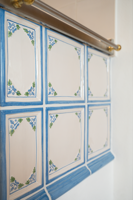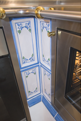 Besonders hervorzuheben ist die extra lange Herdplatte, die so konzipiert wurde, dass alle Temperaturbereiche gleichzeitig genutzt werden können – ideal zum gleichzeitigen Kochen, Braten und Warmhalten. Der Spritzschutz hinter dem Herd besteht ebenfalls aus der passenden Handkeramik, wodurch ein harmonischer und stimmiger Gesamteindruck entsteht.