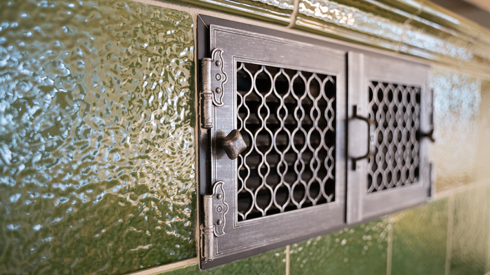 Im Esszimmer sorgen die gemauerten Züge hinter den stilvollen Kacheln mit genarbter Oberfläche für eine langanhaltende, gleichmäßige Strahlungswärme. Diese besondere Kachelstruktur bietet nicht nur einen angenehmen haptischen Effekt, sondern ist auch optisch ein Blickfang.