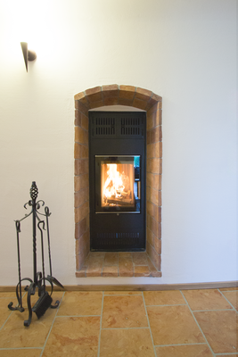 Der Kombi-Ofen wird bequem vom Gang aus befeuert und ist mit einem modernen Ganzglaseinsatz ausgestattet. Dadurch entsteht ein Teil Warmluftbetrieb, der den Raum schnell und effizient erwärmt – ideal für die sofortige Wohlfühltemperatur an kühlen Tagen.