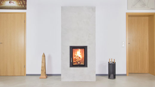 Bei dem abgebildeten Ofen handelt es sich um einen Kombiofen, welcher mit einem hochwertigen Gusseinsatz und einer Isohaube zur sauberen Nachverbrennung mit aufgesetzten keramischen Zügen ausgestattet ist. Diese können durch die Anheizklappe für leichteres Anzünden umgangen werden. Die Reinigungsöffnungen und die Luftgitter wurden als gestalterische Elemente in dem puristischen Kubus verwendet. Die Betonspachteltechnik imitiert den Sichtestrich und bildet somit eine Einheit.