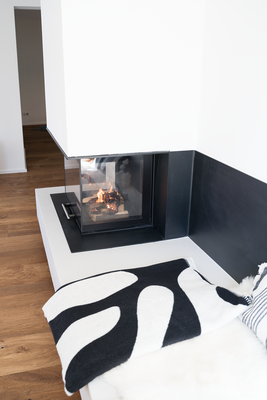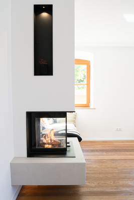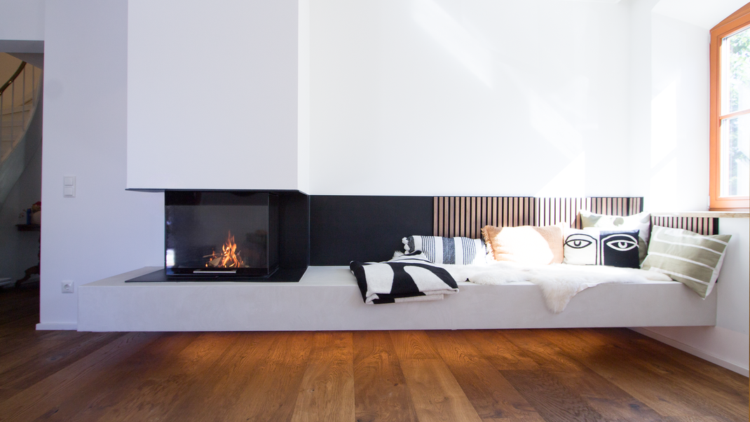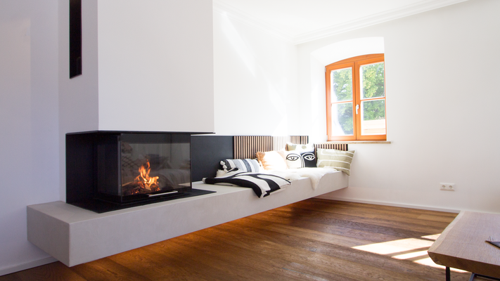 Die komplett schwebende Konstruktion verleiht dem Kamin eine leichte, elegante Optik, während die Sitzbank in Spachteltechnik nicht nur ein Designelement ist, sondern dank integrierter Bankheizung über die Zentralheizung für wohlige Wärme sorgt.